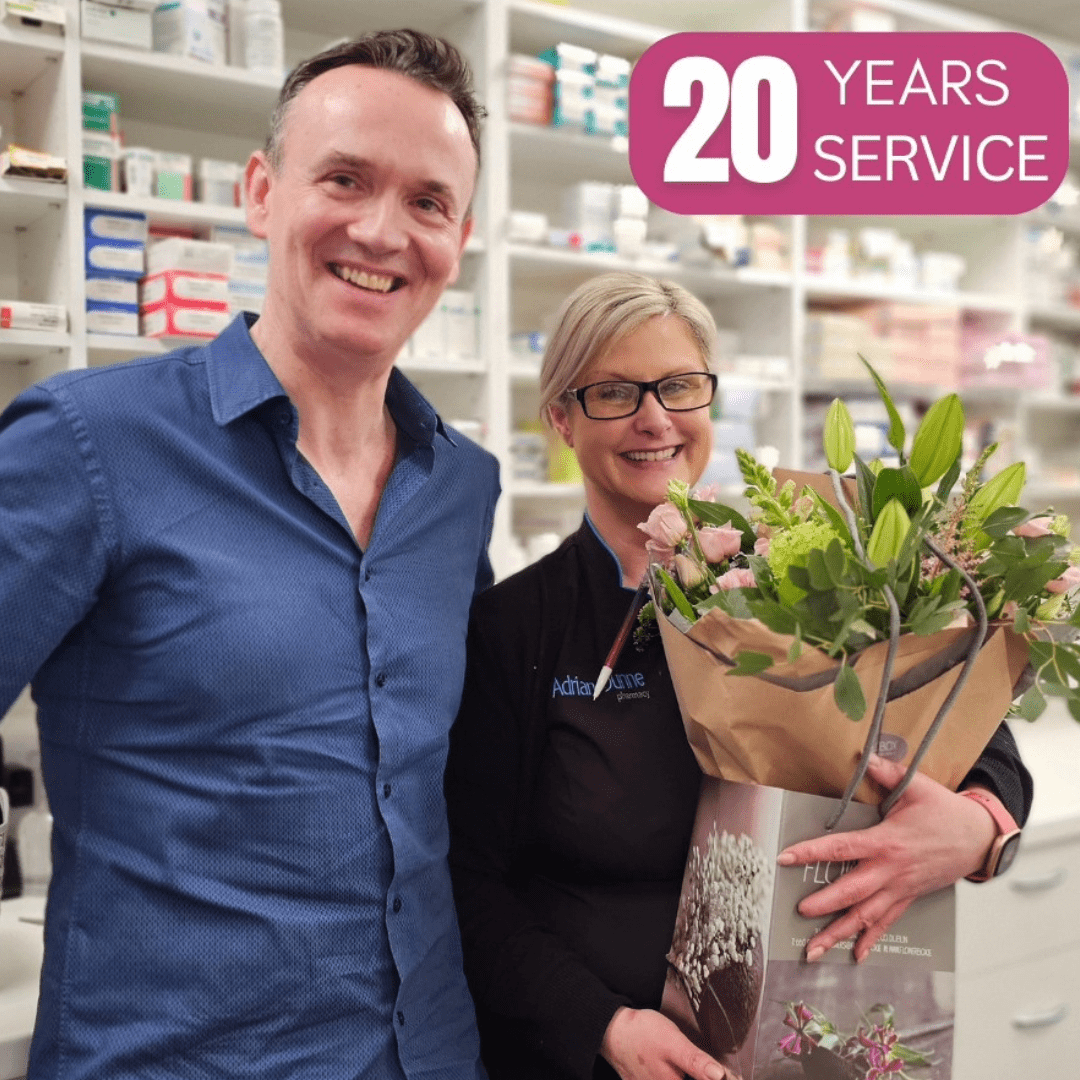February 2024 – Tara, Pharmacy Technician – Trim, celebrating 20 years service with Managing Director, Adrian Dunne