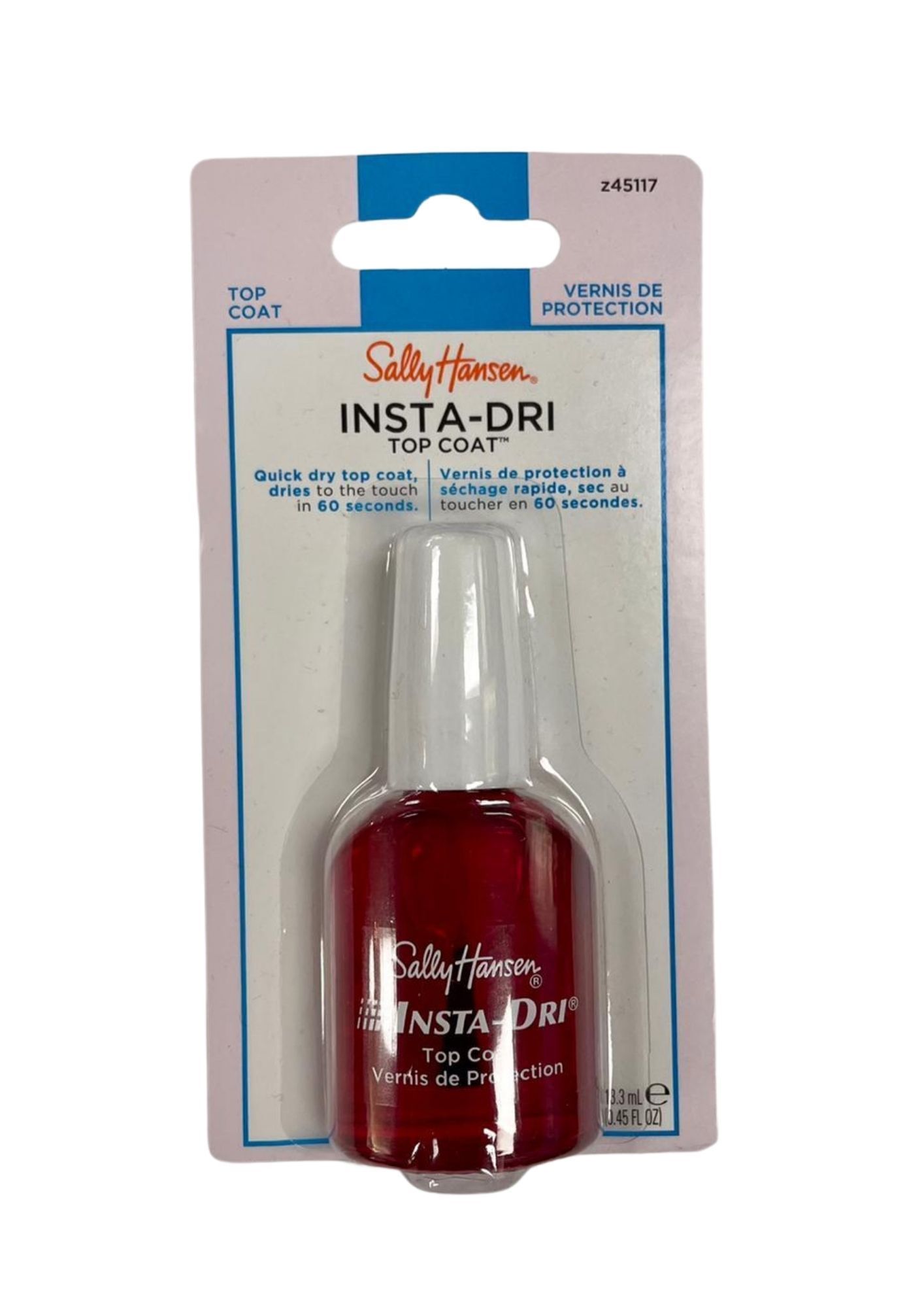 Acrylic polymer complex dries any nail colour in 30 seconds Double UV filters shield manicure from fading and discolouring Helps resist chipping Superior shine Salon tested – Dermatologist tested Sally Hansen Insta-Dri anti chip top coat keeps manicures beautiful up to 10 days. Exclusive acrylic polymer complex helps get you out of the door in a flash just 30 seconds to set. High-gloss superior shine. Double UV filters shield manicure from fading and discolouring. Helps resist chipping. Salon Tested – Dermatologist Tested. Supplied in 13. 3 ml bottle.